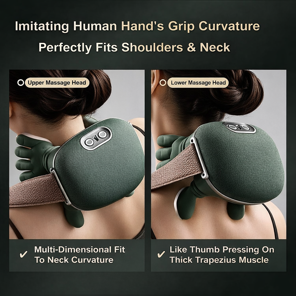 Designed to imitate the natural grip of real hands, this massager contours perfectly to your neck and shoulders, delivering precise pressure where tension builds the most for deeper, more effective relief.